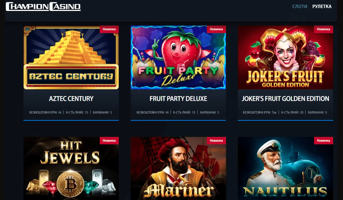Всі ігри Сhampion casino мають надзвичайно корисний опис та крутий український інтерфейс. Крім того, ви знайдете рулетку, блекджек, відеопокер та Колесо фортуни - все це чекає на вас. І вгадайте що? Всі вони українською мовою і чудово працюють на вашому мобільному пристрої, тому ви можете грати в будь-який час і в будь-якому місці! У них також є безліч різних ставок, чудова графіка та шанс виграти джекпот. Отже, ви можете зануритися в деякі першокласні ігри, легко платити і відразу ж отримувати свій виграш. Наскільки це чудово?